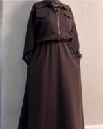 Own your presence with this effortlessly modest two-piece set. Featuring a rich brown button-down top layered over a crisp white inner and a flowing brown maxi skirt, this outfit blends comfort with quiet confidence. Finished with a light headscarf and clean white sneakers, it’s a look that says: “I know who I am.” Perfect for women who dress with intention and lead with grace.