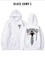 This beautiful hoodie makes a statement from every angle. The front features a minimalist “BEHIND” logo with a dangling character, while the back showcases a dramatic full-size illustration—chains, sword, and all—under the powerful message: “THERE IS ALWAYS SOMETHING BEHIND.”